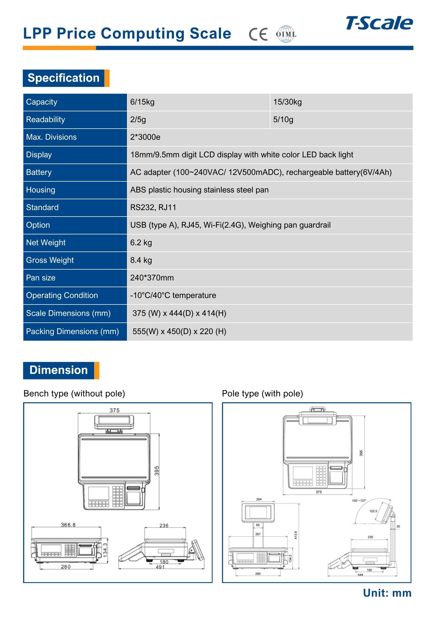 Capacities:3kg/6kgx1g/2g;6kg/15kgx2g/5g; 15kg/30kgx5g/10g