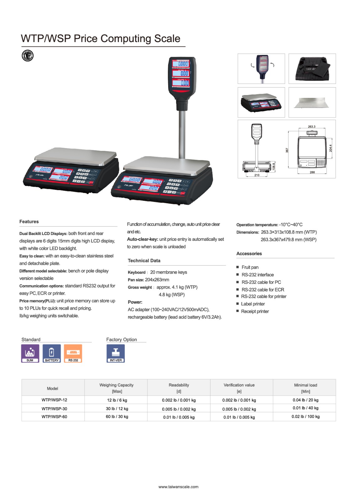Capacities:12lb/6kg x 0.002lb/0.001kg; 30lb/12kg x 0.005lb/0.002kg; 60lb/30kg x 0.01lb/0.005kg